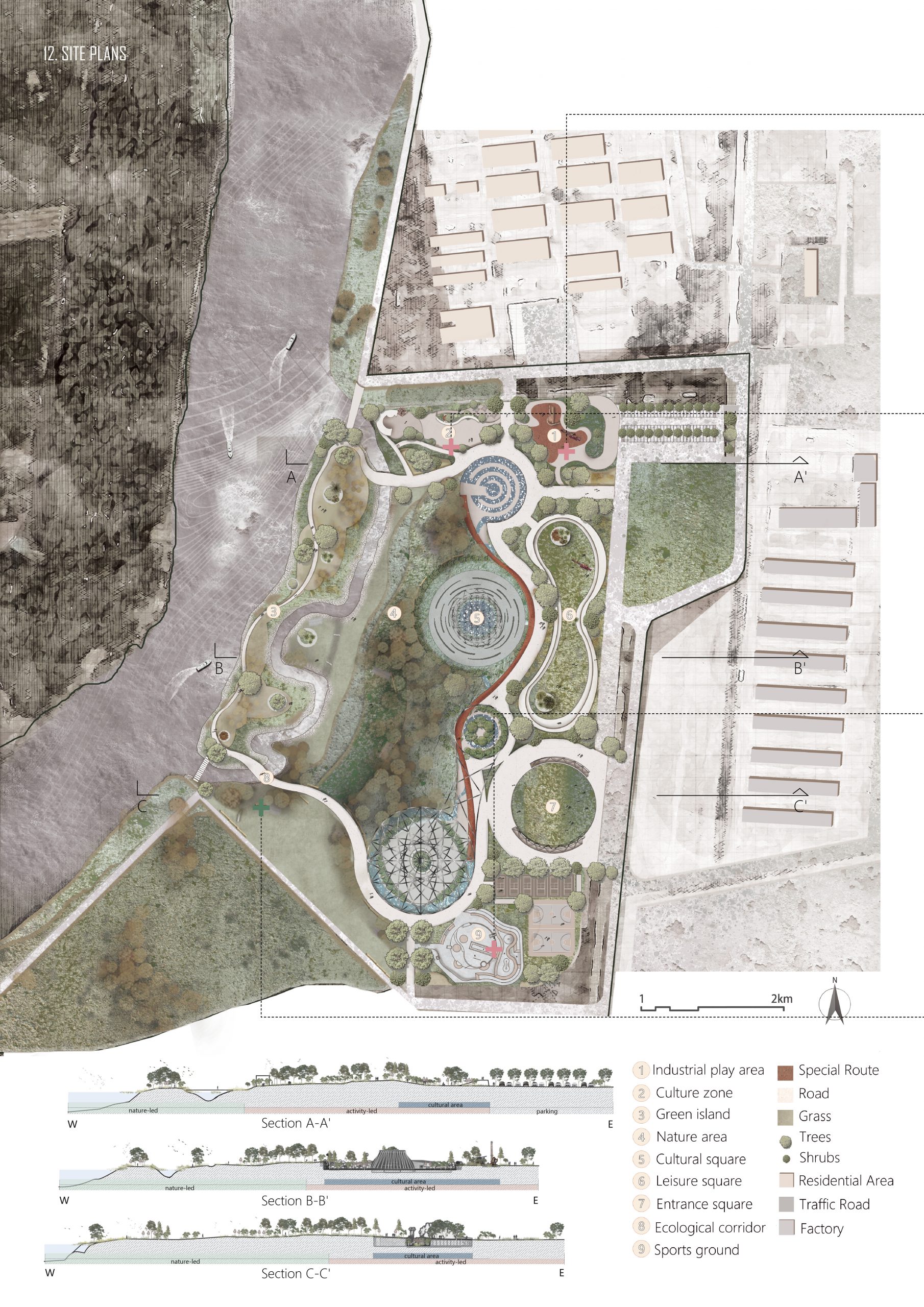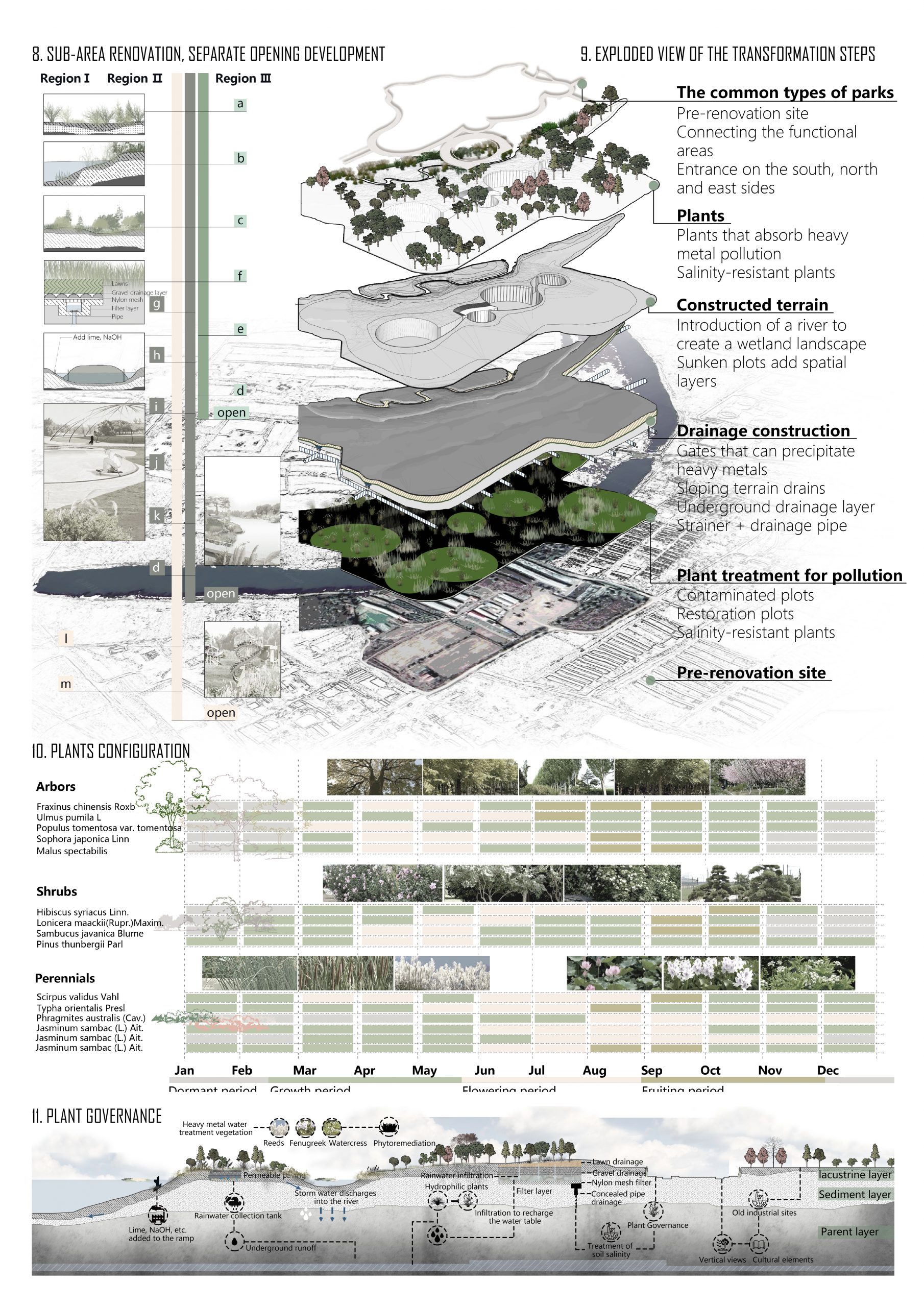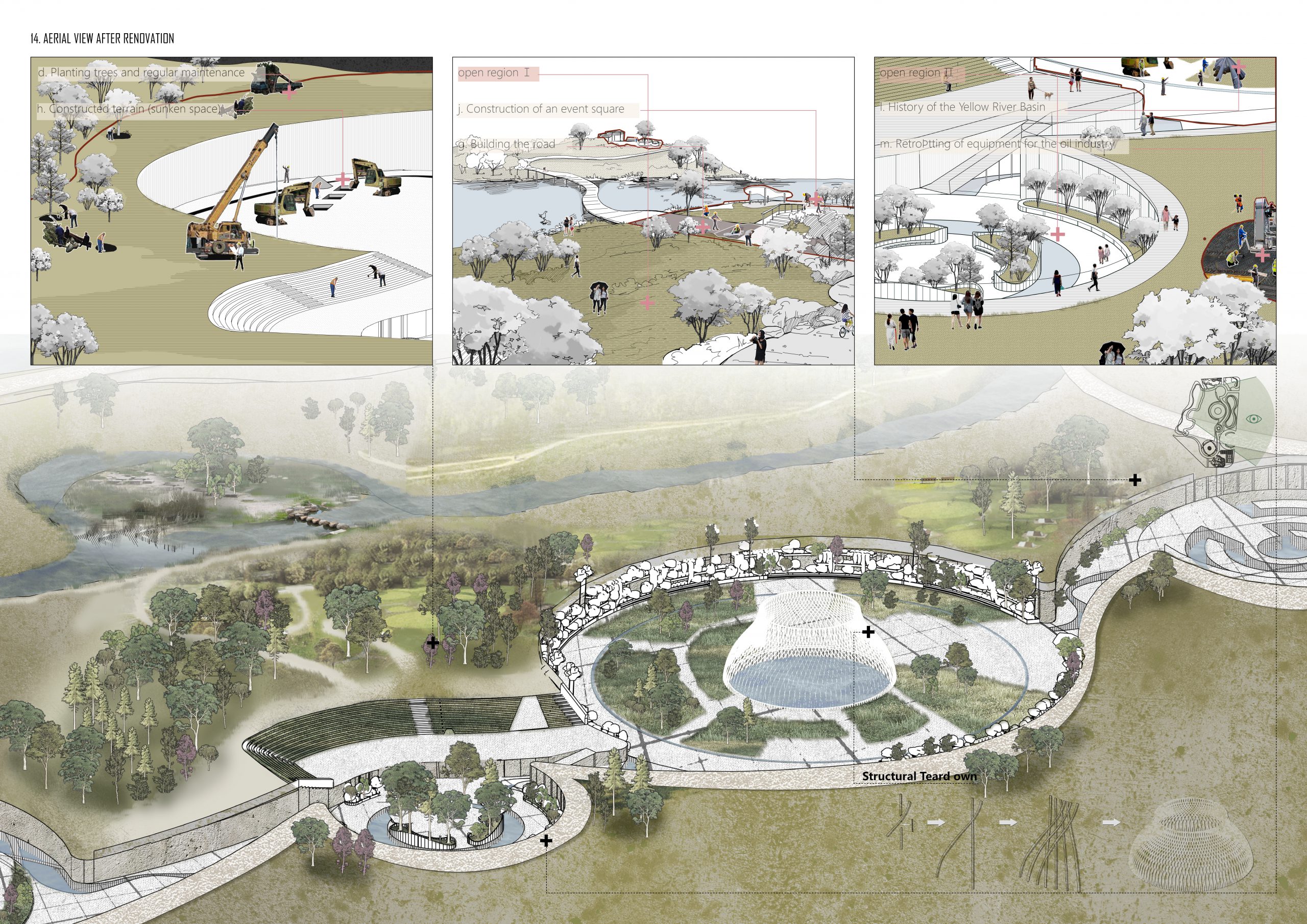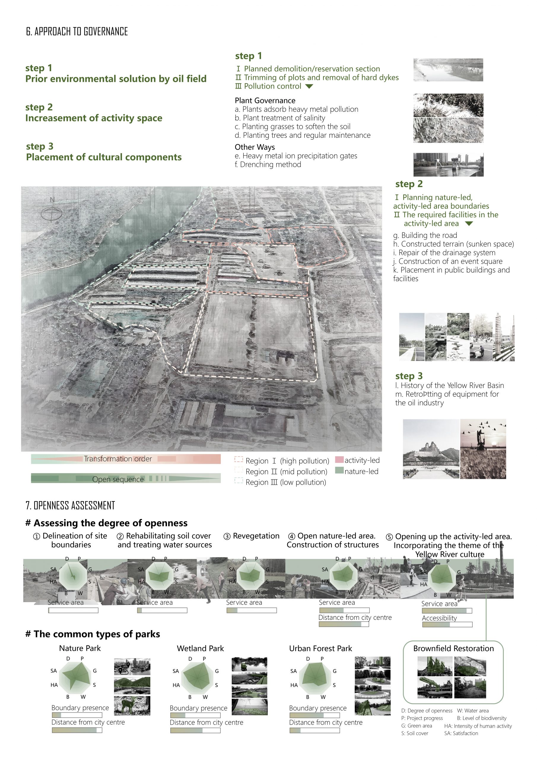 In the context of the modern development of the Yellow River Basin for pollution control and reactivation, this project is the brownfield remediation of the contaminated site to create a park that looks for balance between ecology and activities. The step development concerning eco governance will be the starting phase for land treatment, followed by the activity development and culture insert promoting the native humanity features, culture preservation and oilfield culture popularisation. The treatment uses a phased opening of activated park areas, which is an adaptive solution for eco-diversity and sustainability. This approach ensures that inhabitants have zones with different activity frequencies and ecological concentrations.