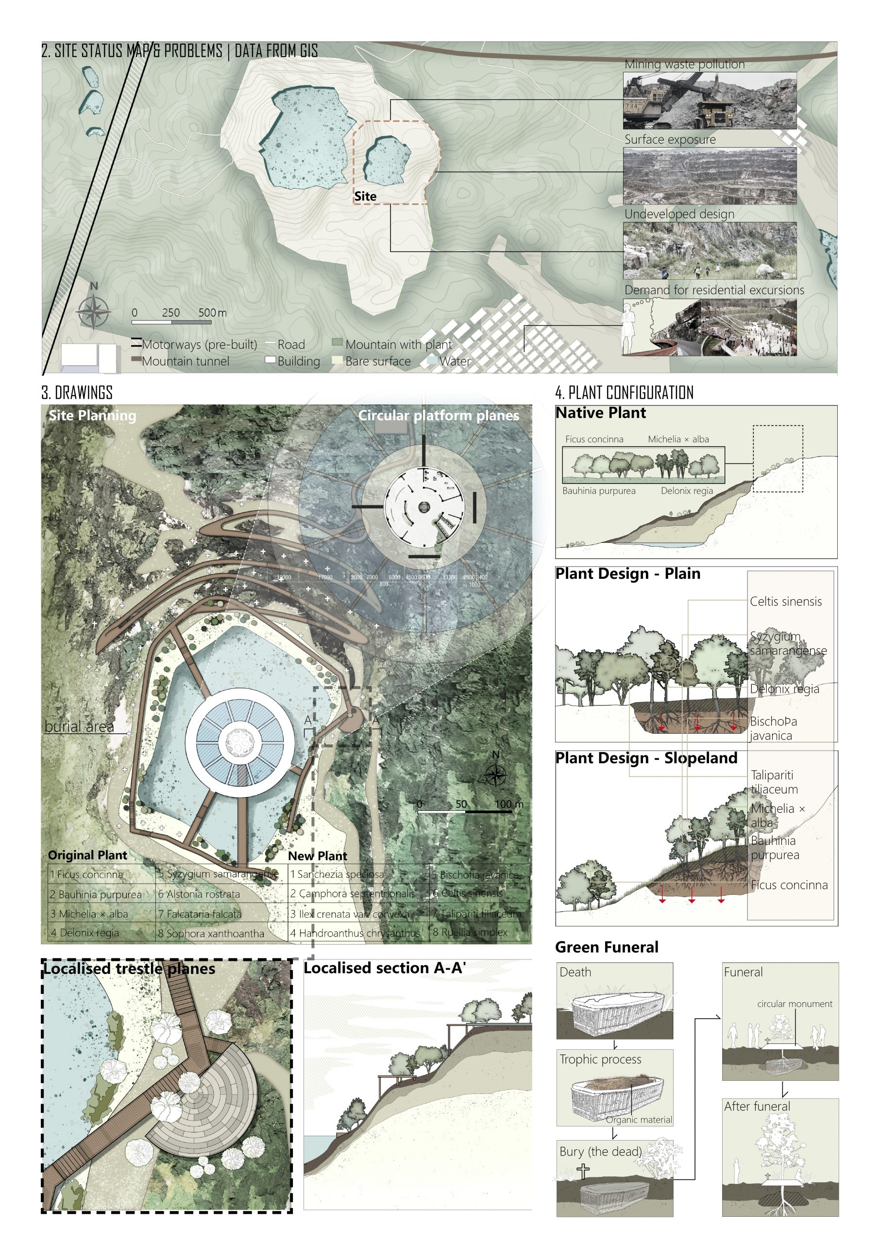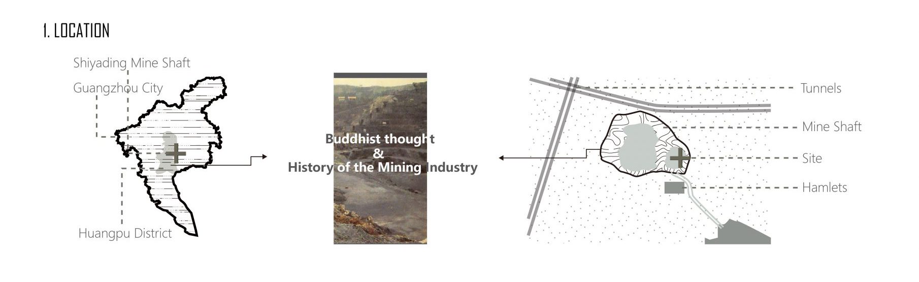 No Self is a monumental landscape and burial design project that unfolds through the universal precepts of Buddhism. In the contemplation of Buddhism’s ALL DHARMAS HAVE NO SELF. The industrial history of the Shiyading mine site in Guangzhou is dismantled into the will to live of specific individuals, restoring the diminished scale of life of the workers in the giant wheel of modernisation.
