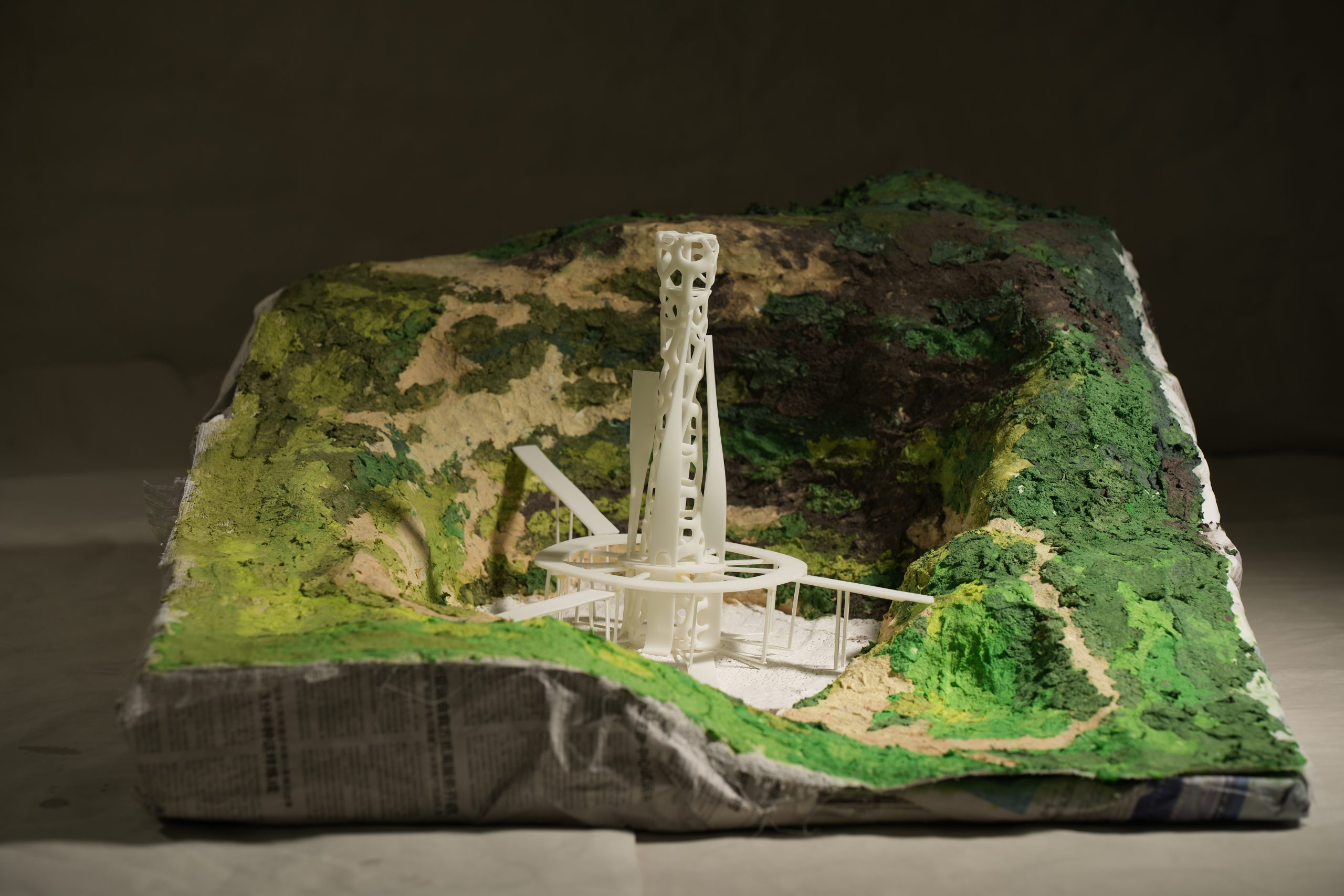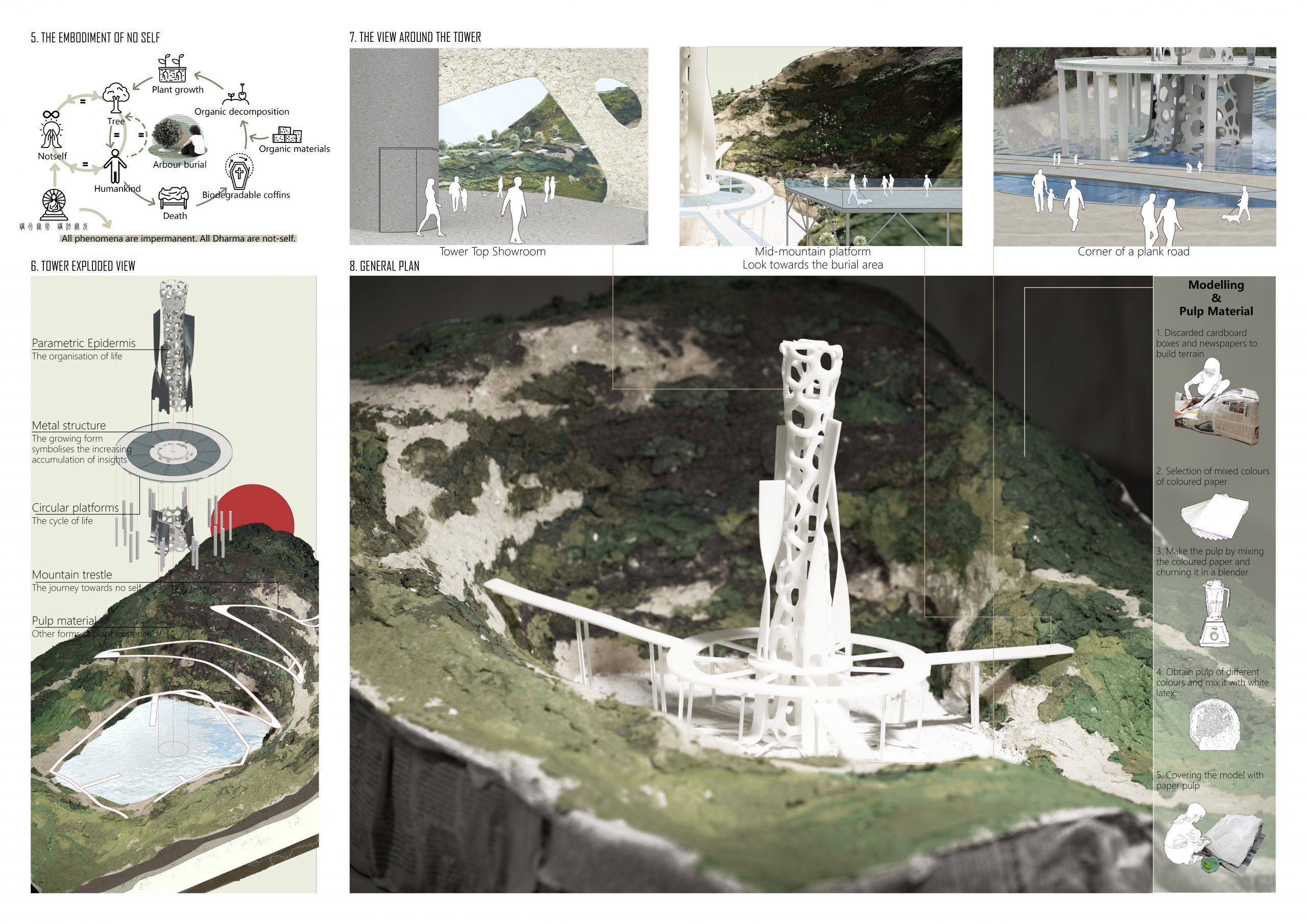 Inspired by the idea of the cycle of life and the connection between one life and the next, the project places a parametric-skin tower in the centre of the pit. This guides the connection between heaven and earth and life with an upright block, and the tower becomes a means of expression to describe the endlessness and longevity of life. The pit’s mountain stacks are connected to the circular platforms, and the recurring loops of life roam or are anchored in the landscape, helping to strip away ideas and human life forms and integrate them into the life of the Mahatman.